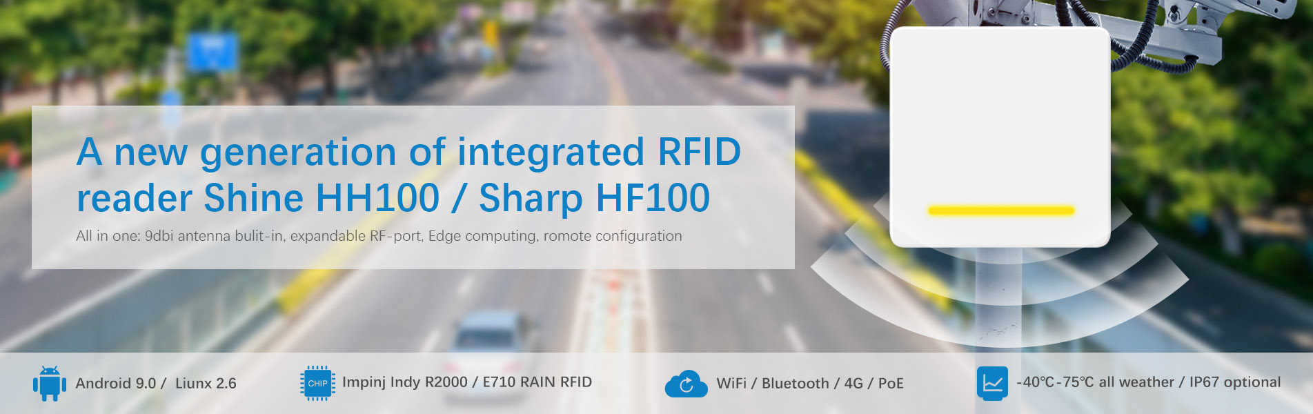 Hopeland HF100 2-port integrated RFID reader is a newly-developed long distance RFID reader that can achieve a long reading distance of 12m. It can support GEN2, V2/ DNA tag and temperature & humidity sensor. This integrated RFID reader can be deployed in smart warehousing, highway toll collection, logistics and more industries.